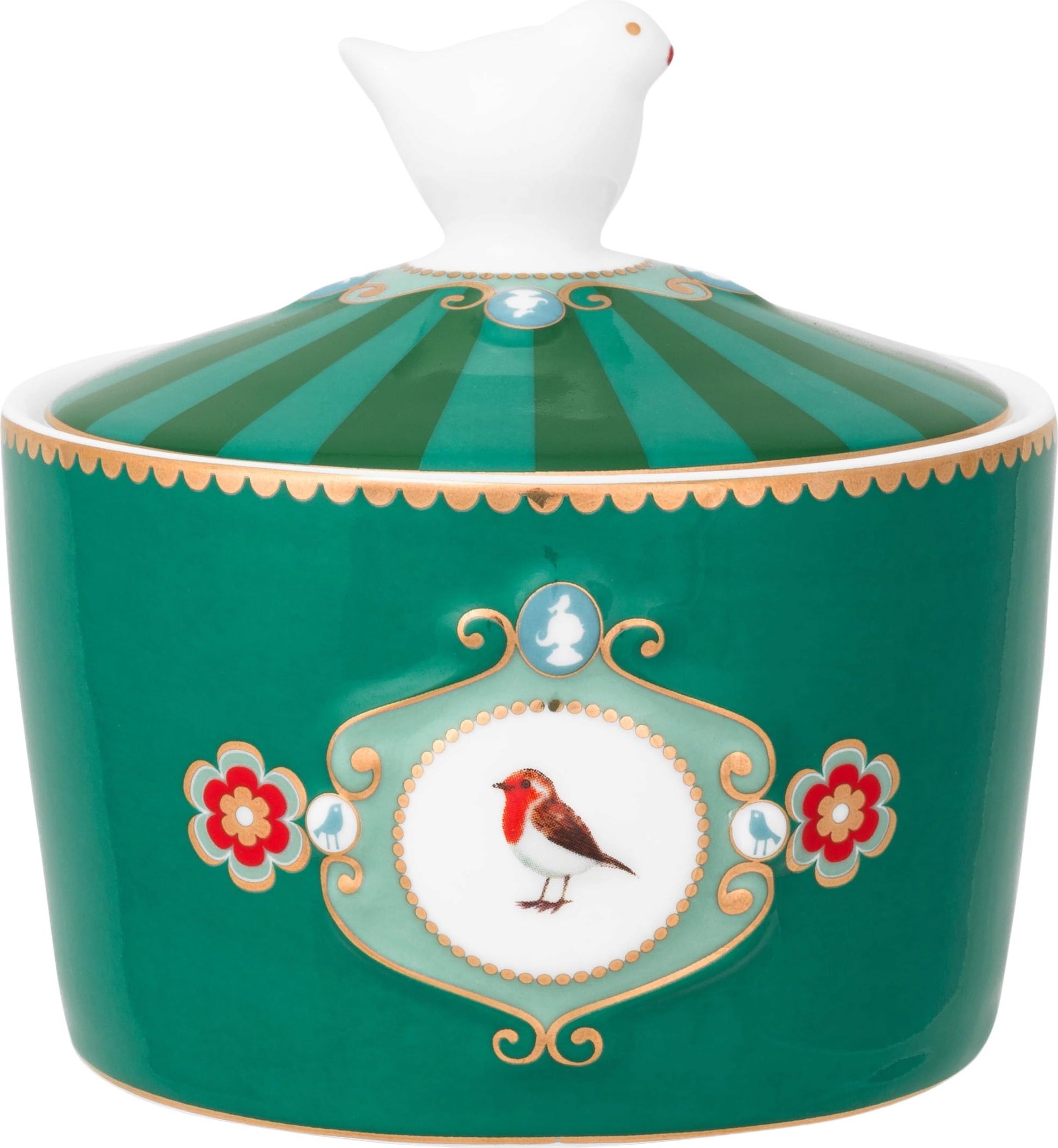Met deze suikerpot van Pip Studio verrijk je niet alleen elke theetijd, maar trek je ook zeker veel aandacht! Love Birds, de naam van het ontwerp, zegt het al, want een schattig roodborstje siert het midden van de suikerpot, terwijl gouden elementen en een stijlvol patroon van vormen en strepen het ontwerp perfect afmaken. De kroon op het werk is een porseleinen vogel die de finishing touch geeft aan de deksel.