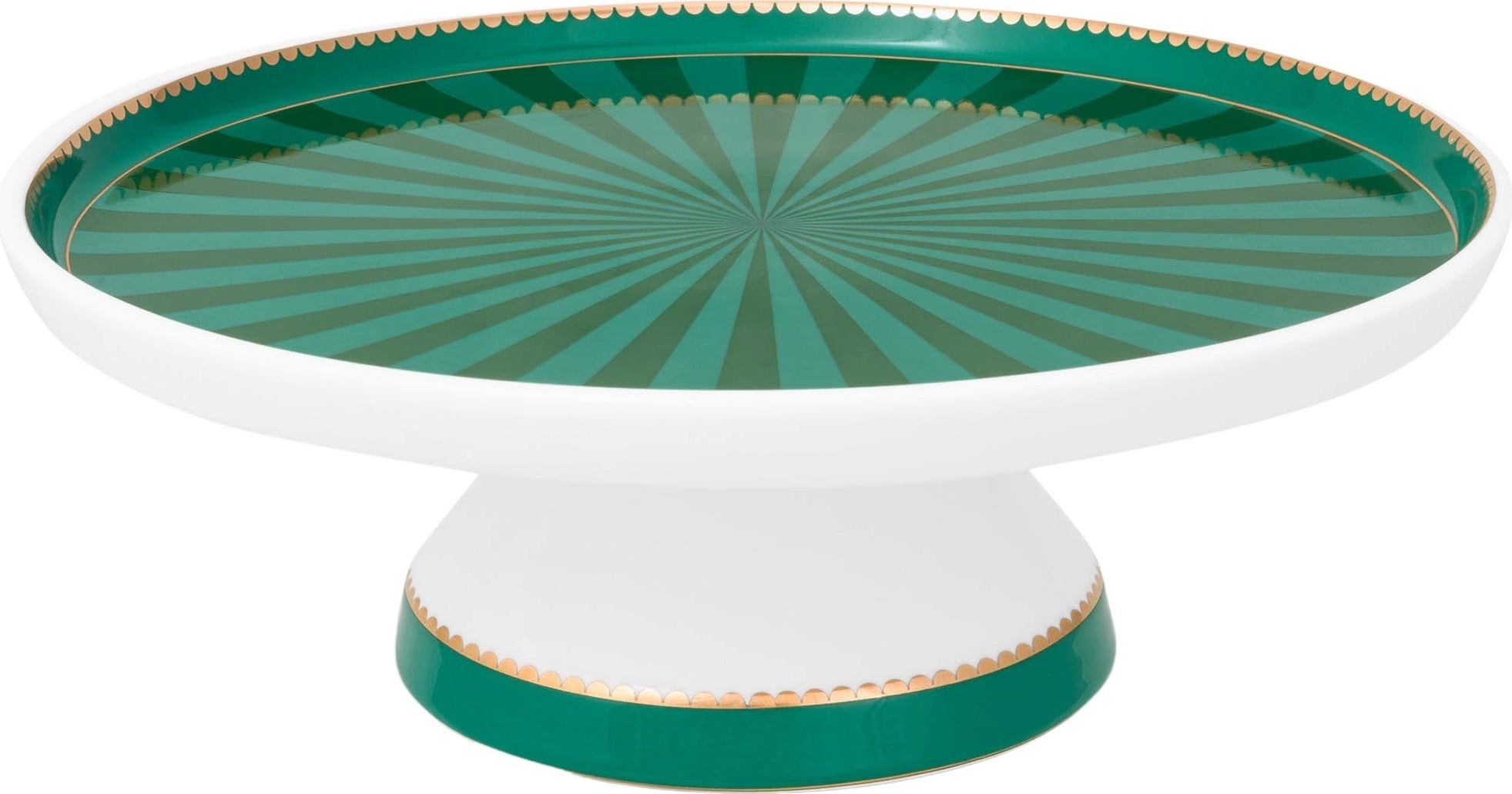 Deze stijlvolle taartstandaard valt op door zijn unieke ontwerp. Het oppervlak is versierd met een harmonieus patroon van bijpassende strepen die vanuit het midden uitstralen en meteen voor een vrolijke sfeer zorgen. Gouden accenten geven een luxueus tintje, terwijl de eenvoudige, witte voet voor stabiliteit zorgt en het kleurrijke design nog meer laat opvallen. Gemaakt van het fijnste porselein, belooft deze taartstandaard bovendien een bijzonder elegante uitstraling en aangename feel.