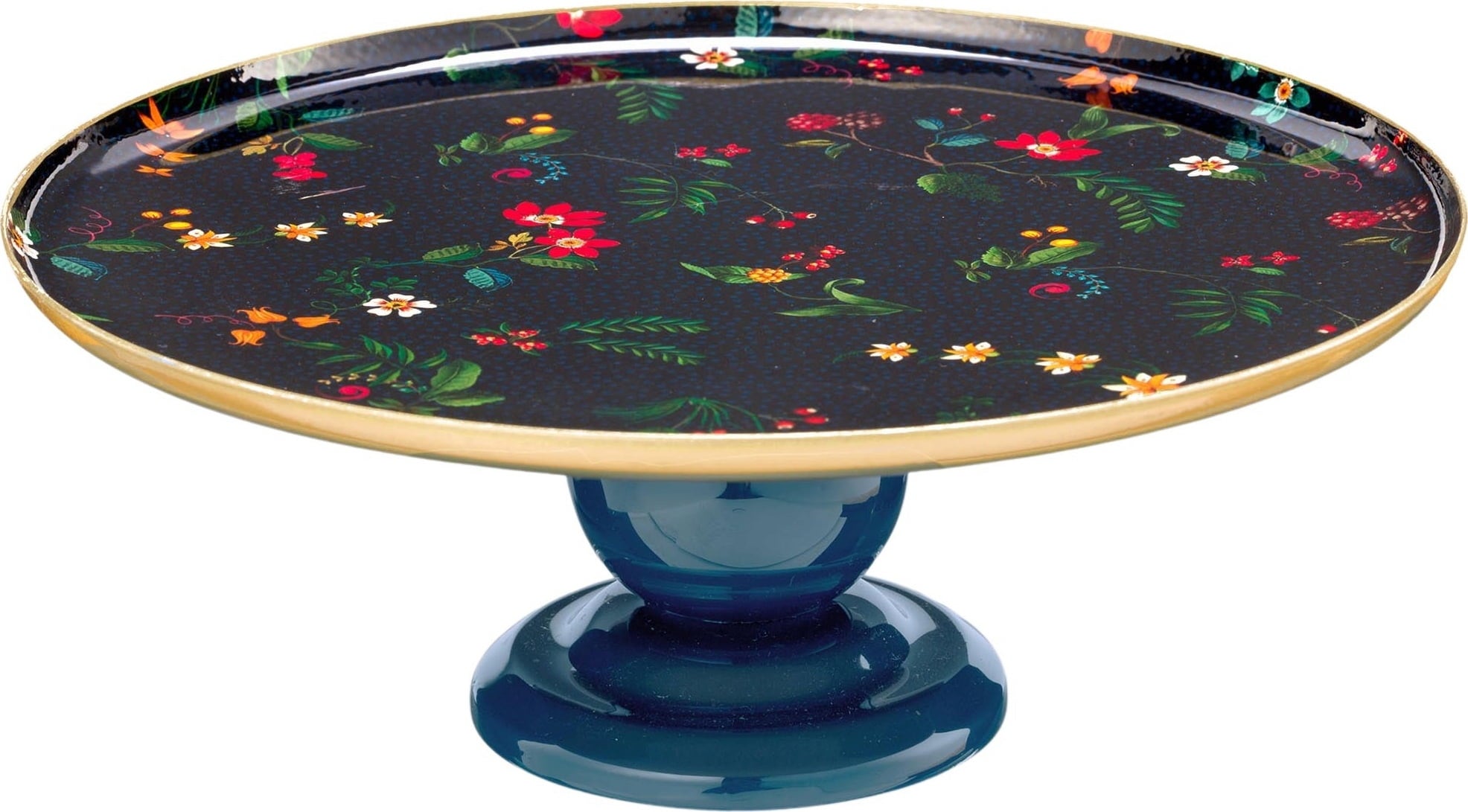 De stevige voet van de taartstandaard is uitgevoerd in glanzend marineblauw, wat de basiskleur van het bord oppakt en zorgt voor een harmonieus geheel. Deze taartstandaard is gemaakt van metaal en is robuust en duurzaam. Het is een veelzijdig decoratief element dat ook kan worden gebruikt als presentatievlak voor fruit of kleine hapjes.