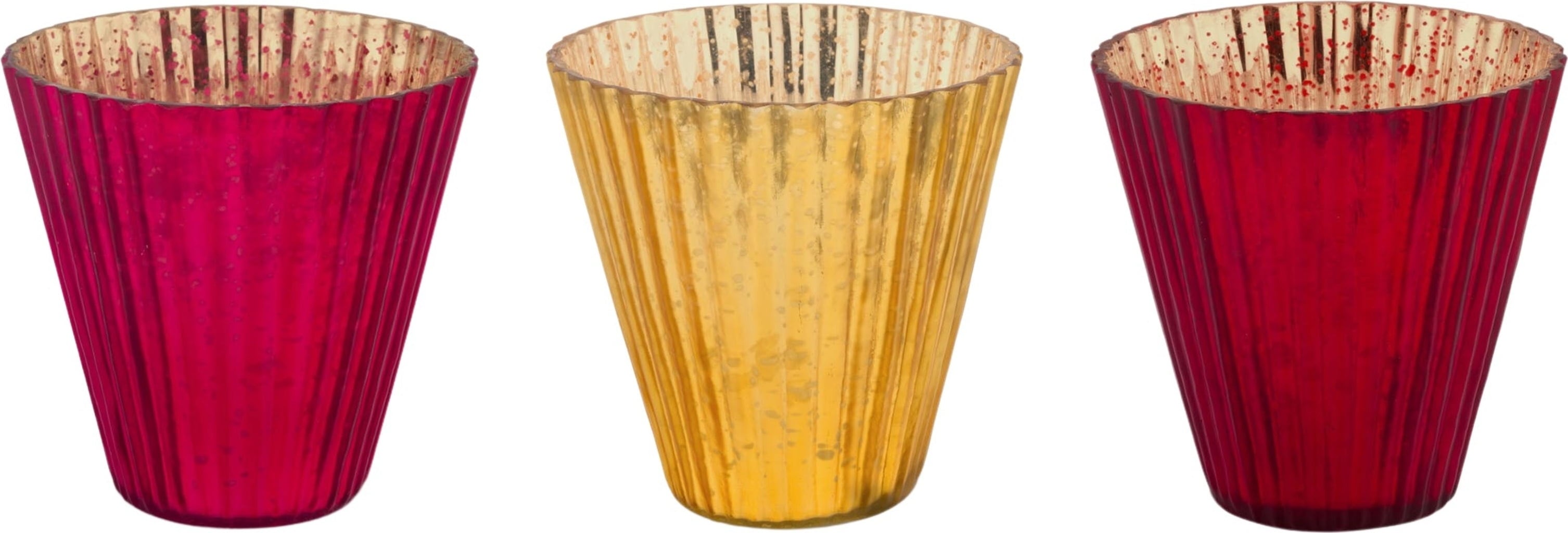 De theelichthouders zijn gemaakt van glas en hebben een geribbelde, bekerachtige vorm. Ze zijn verkrijgbaar in drie verschillende, warme en feestelijke kleuren. Met hun afmetingen van 10 x 10,5 cm per stuk zijn de waxinelichthouders gegarandeerd perfect voor standaard waxinelichtjes. Ze zijn een veelzijdig decoratief element dat zowel geschikt is voor de kerstperiode als voor gezellige avonden het hele jaar door.