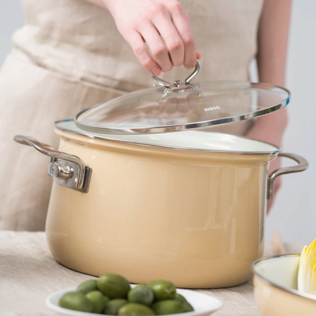 Deze vleespan in elegante ivoorlook en in de topkwaliteit van RIESS - past bij iedereen die op zoek is naar gedempte kleuren, moderne vormen en hoge functionaliteit. Ontworpen in onze topkwaliteit met extra sterke stalen warmtevasthoudende bodem en glazen deksel.
