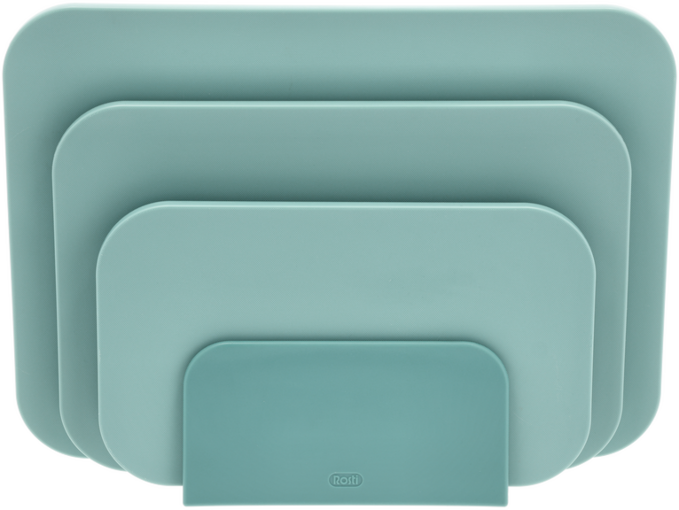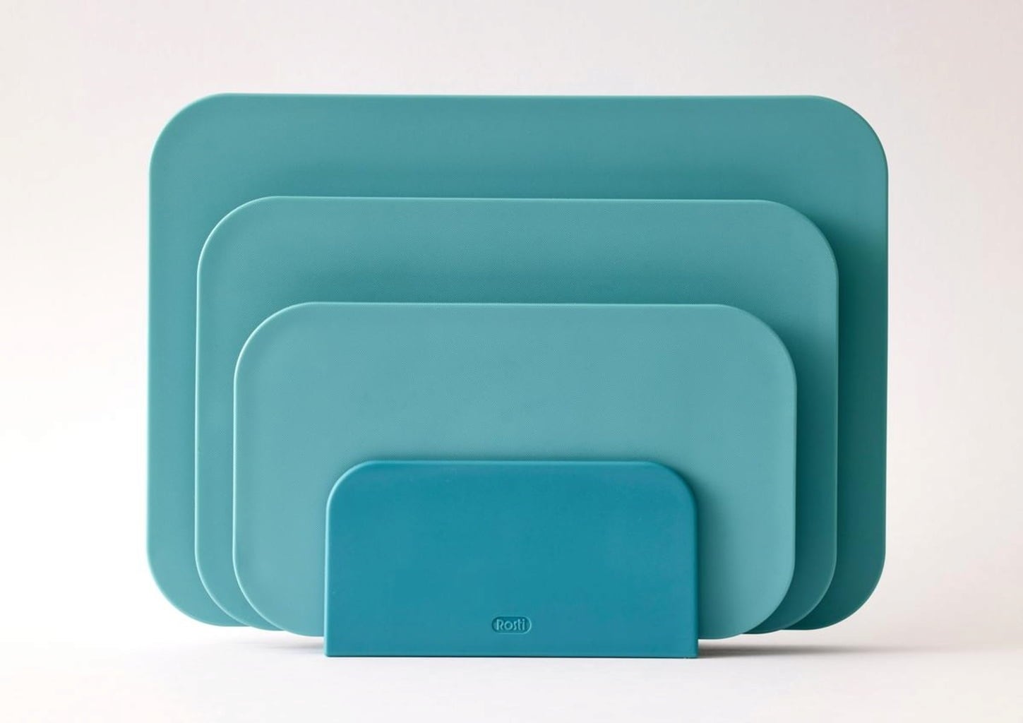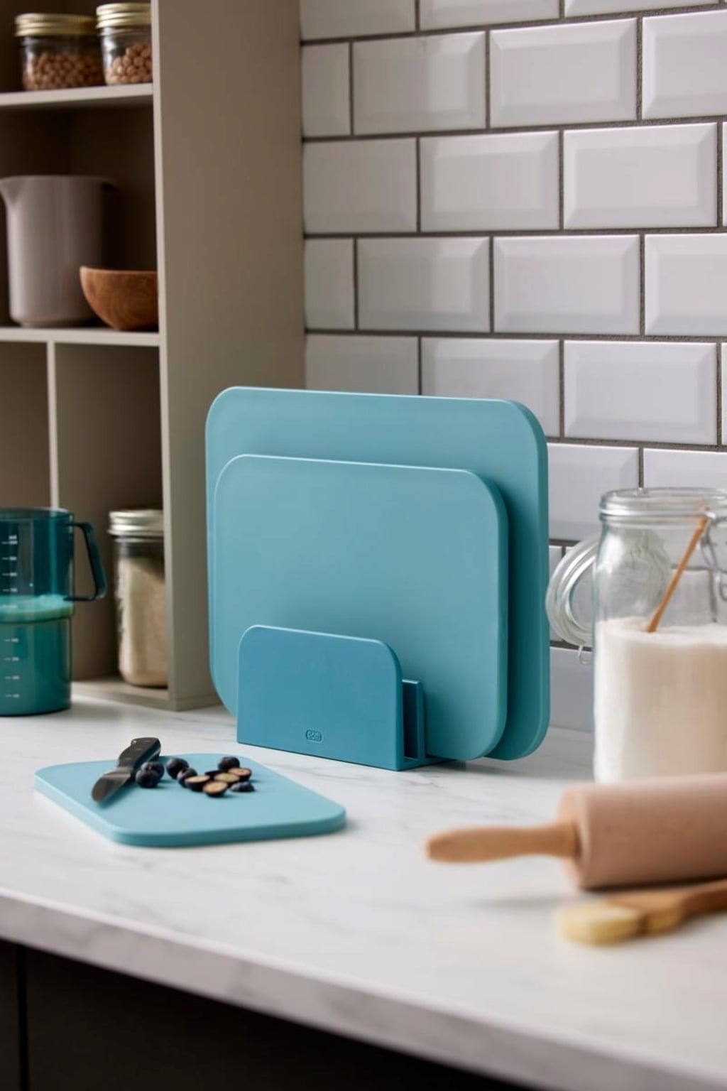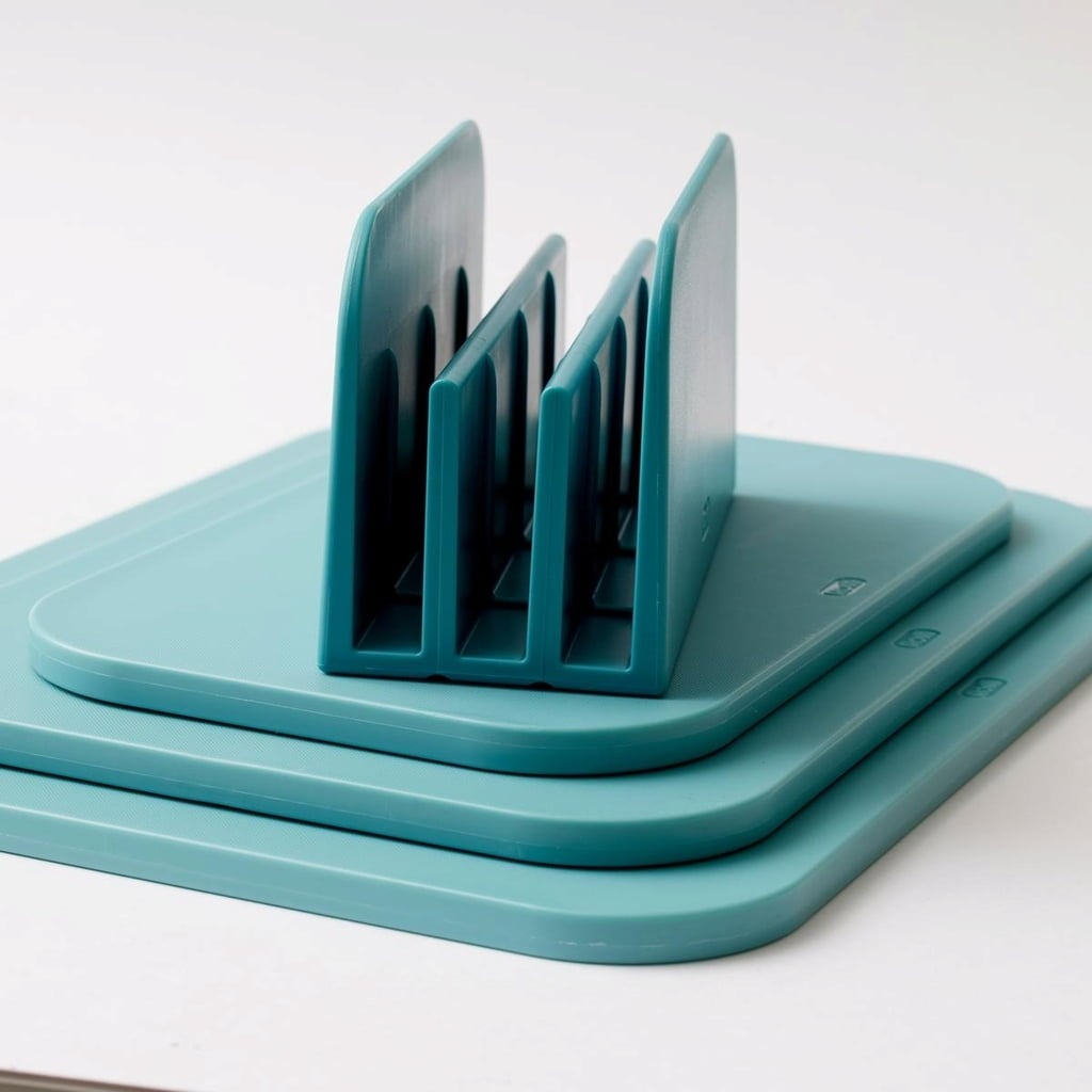 De set bevat een praktische houder die niet alleen ruimte bespaart, maar ook zorgt voor een betere hygiëne. De houder houdt de snijplanken op afstand van elkaar, zodat ze na gebruik goed geventileerd zijn. Groeven aan de onderkant zorgen voor een optimale luchtcirculatie, ook als een plank nog nat is.