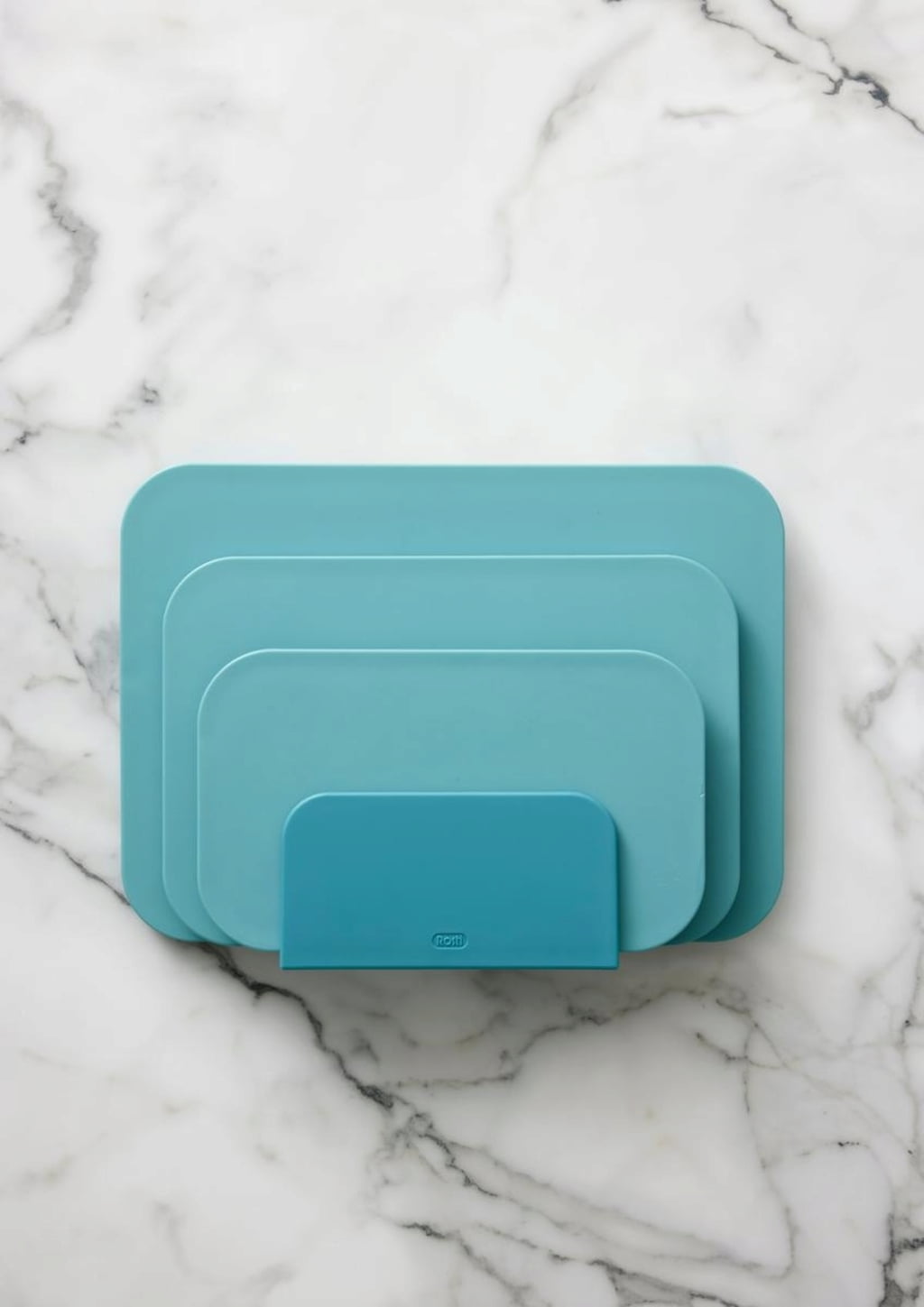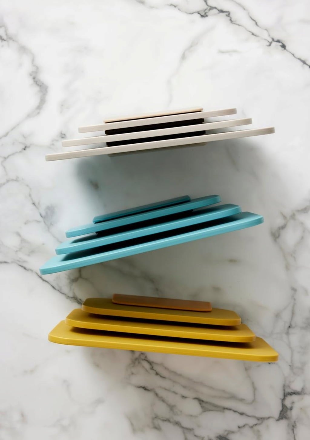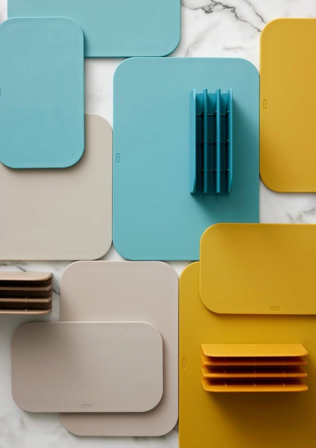 De set bevat een praktische houder die niet alleen ruimte bespaart, maar ook zorgt voor een betere hygiëne. De houder houdt de snijplanken op afstand van elkaar, zodat ze na gebruik goed geventileerd zijn. Groeven aan de onderkant zorgen voor een optimale luchtcirculatie, ook als een plank nog nat is.
