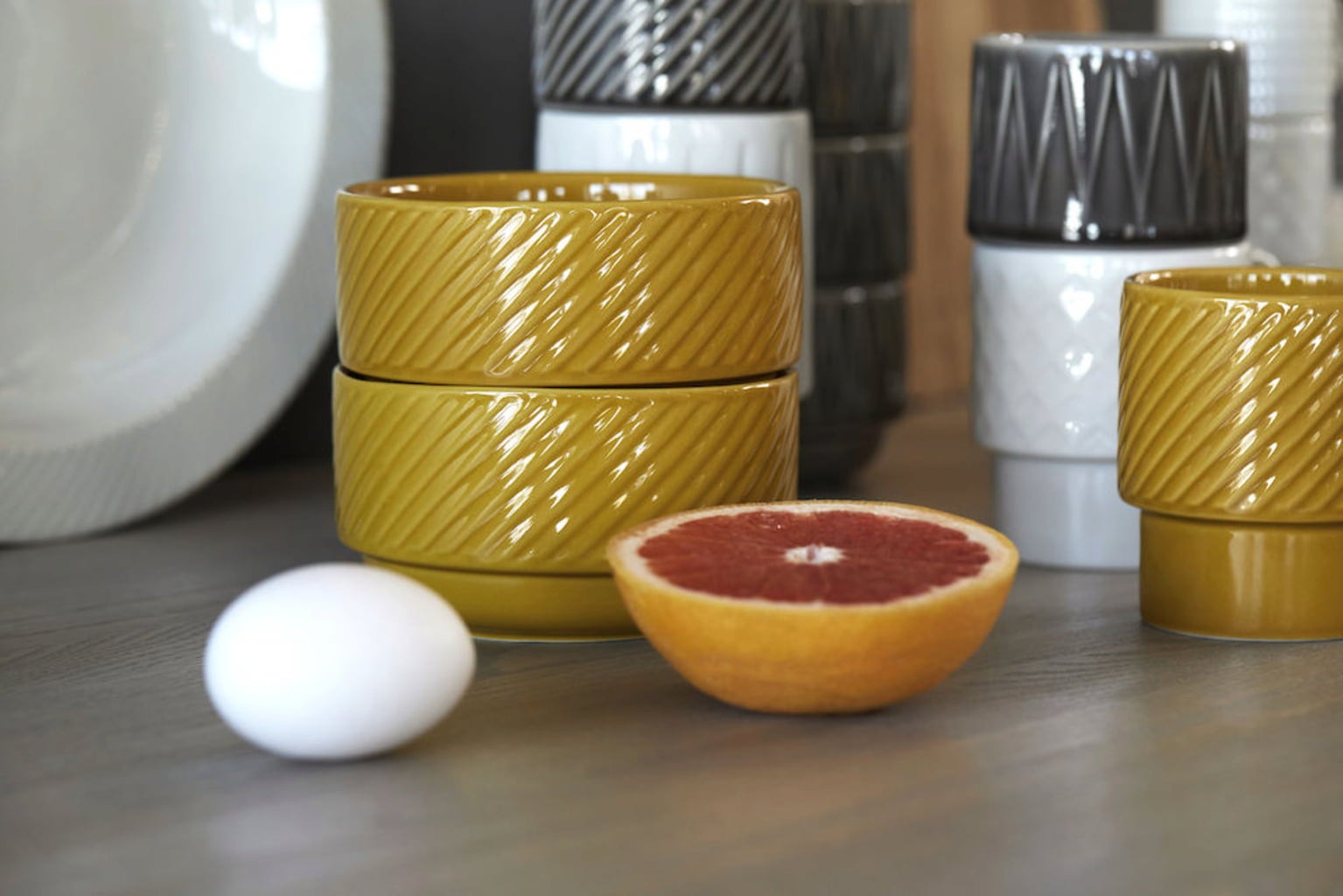 Deze prachtige kommen zijn samen met ontwerpster Margot Barolo ontwikkeld en hebben een uitzonderlijke reliëflook, die doet denken aan de stijl van de jaren '70. De patroon, vorm en kleuren vullen elkaar perfect aan en zijn een bijzonder servies op je eettafel.