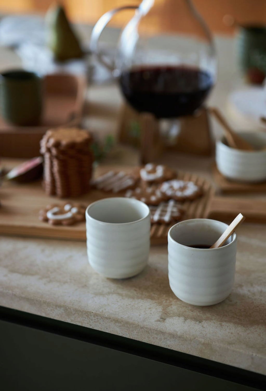 Ze overtuigen door hun gedempte kleuren en zacht gegroefde oppervlaktestructuur en zijn dankzij hun vulvolume van 180 ml ideaal voor espresso, glühwein en andere heerlijke dranken.