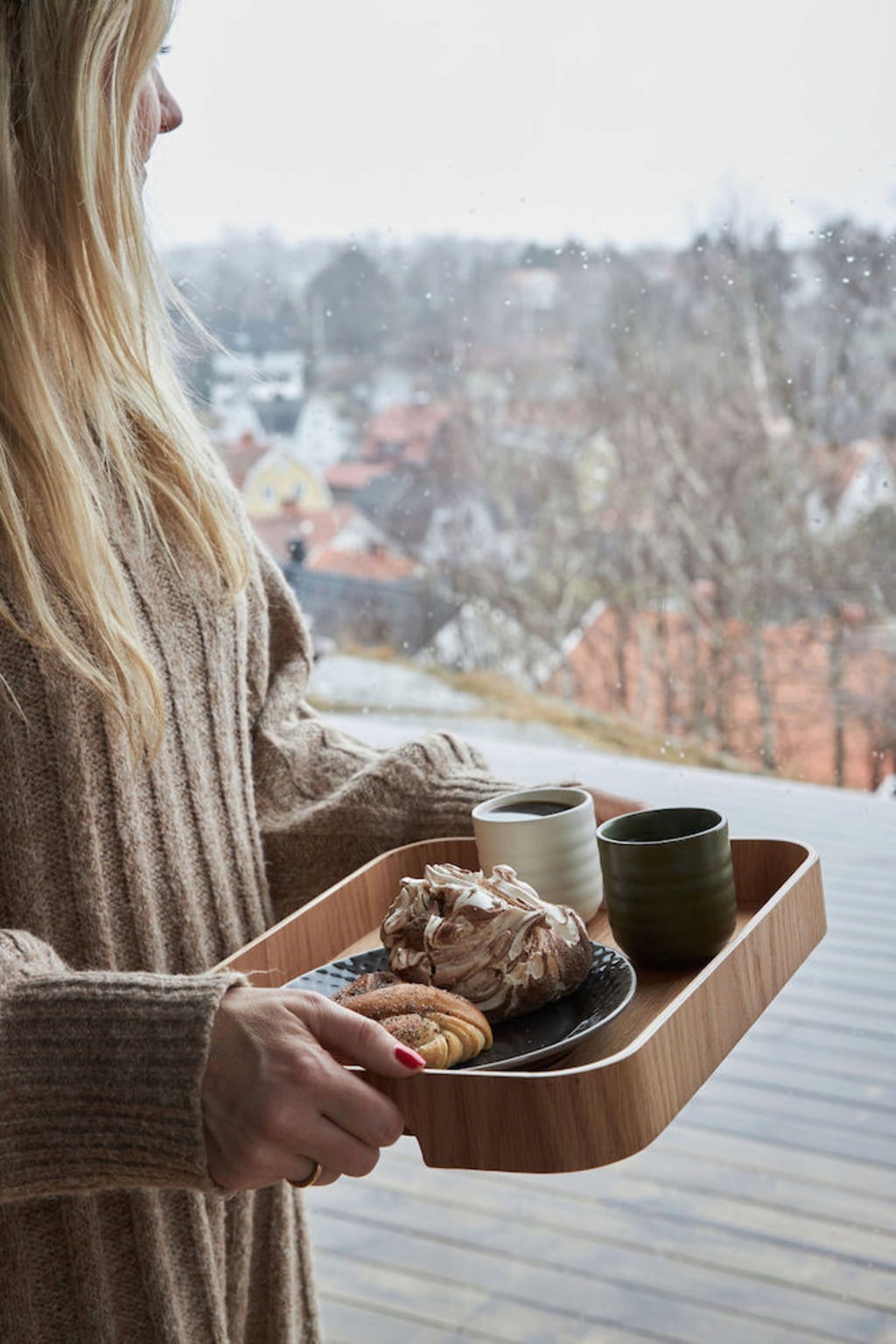 De twee geïntegreerde handgrepen aan de zijkanten maken het makkelijk te dragen en de opstaande randen houden kommen, glazen en borden stevig op hun plaats. Het dienblad is gemaakt van robuust eikenhout, is extreem duurzaam en maakt indruk met zijn tijdloze en slimme ontwerp!