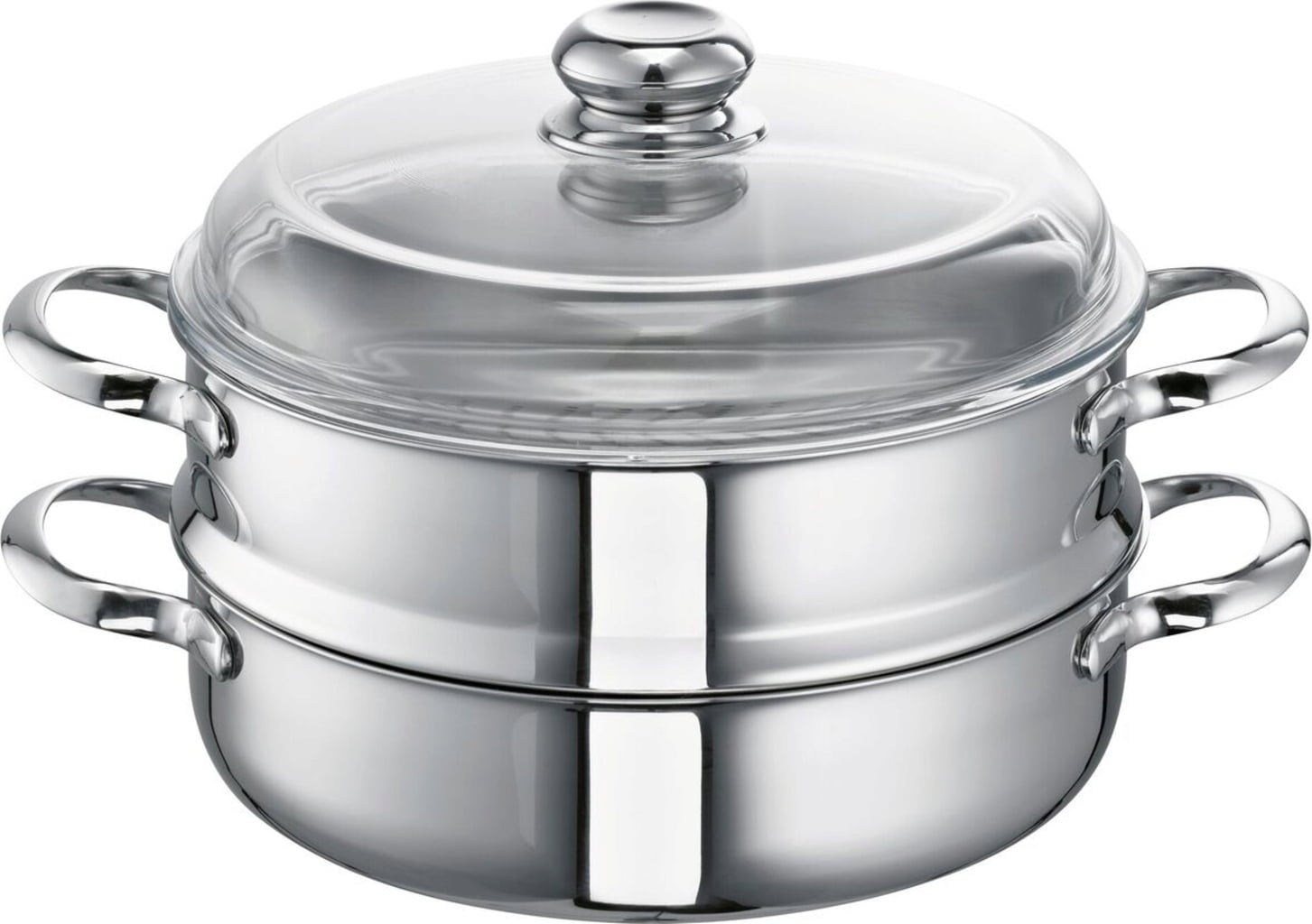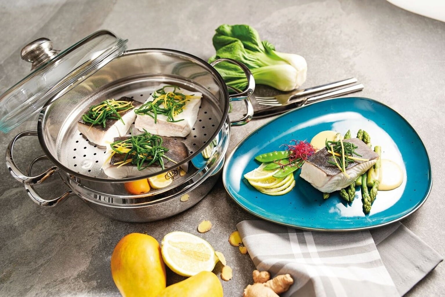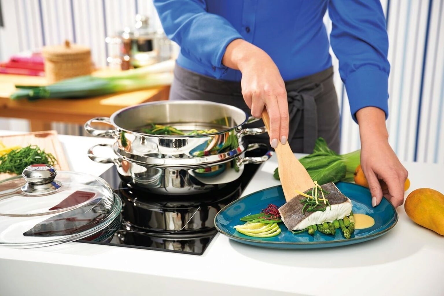 Pan, stoompan en deksel - geen goed uitgeruste keuken mag zonder dit hoogwaardige trio ontbreken. Gemakkelijk schoon te maken en energiebesparend dankzij roestvrij staal met een speciale protherm® koperen bodem. Dit laatste zorgt er ook voor dat de stoomovencombinatie gebruikt kan worden op alle standaard kookplaten.