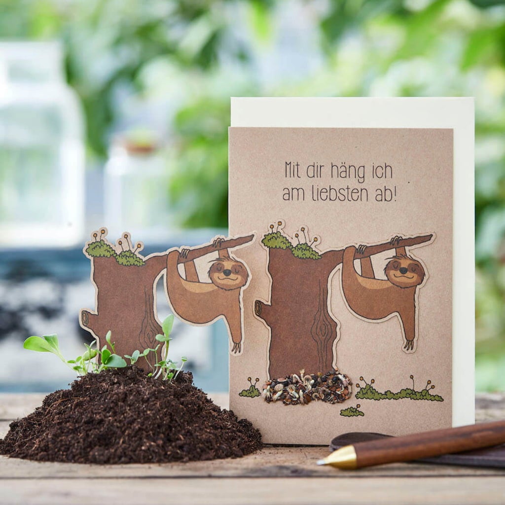Als je een geliefde duidelijk wilt maken dat je van hem of haar houdt en dat de tijd die je samen doorbrengt iets kostbaars voor je is, dan zal deze schattige luiaard je zeker helpen. De wenskaart zorgt niet alleen voor een glimlach en liefdevolle blikken, maar verrast ook met prachtige wilde bloemenzaden.