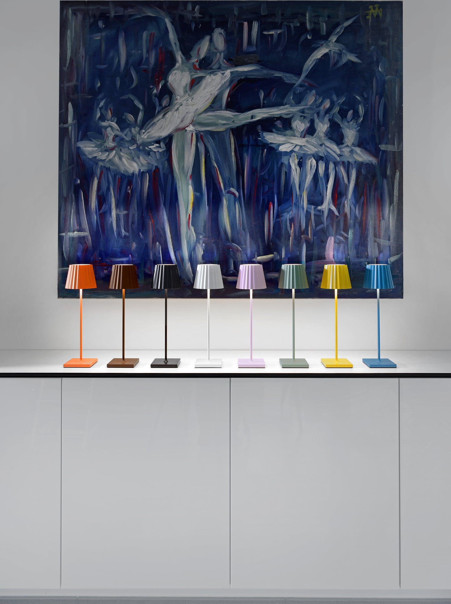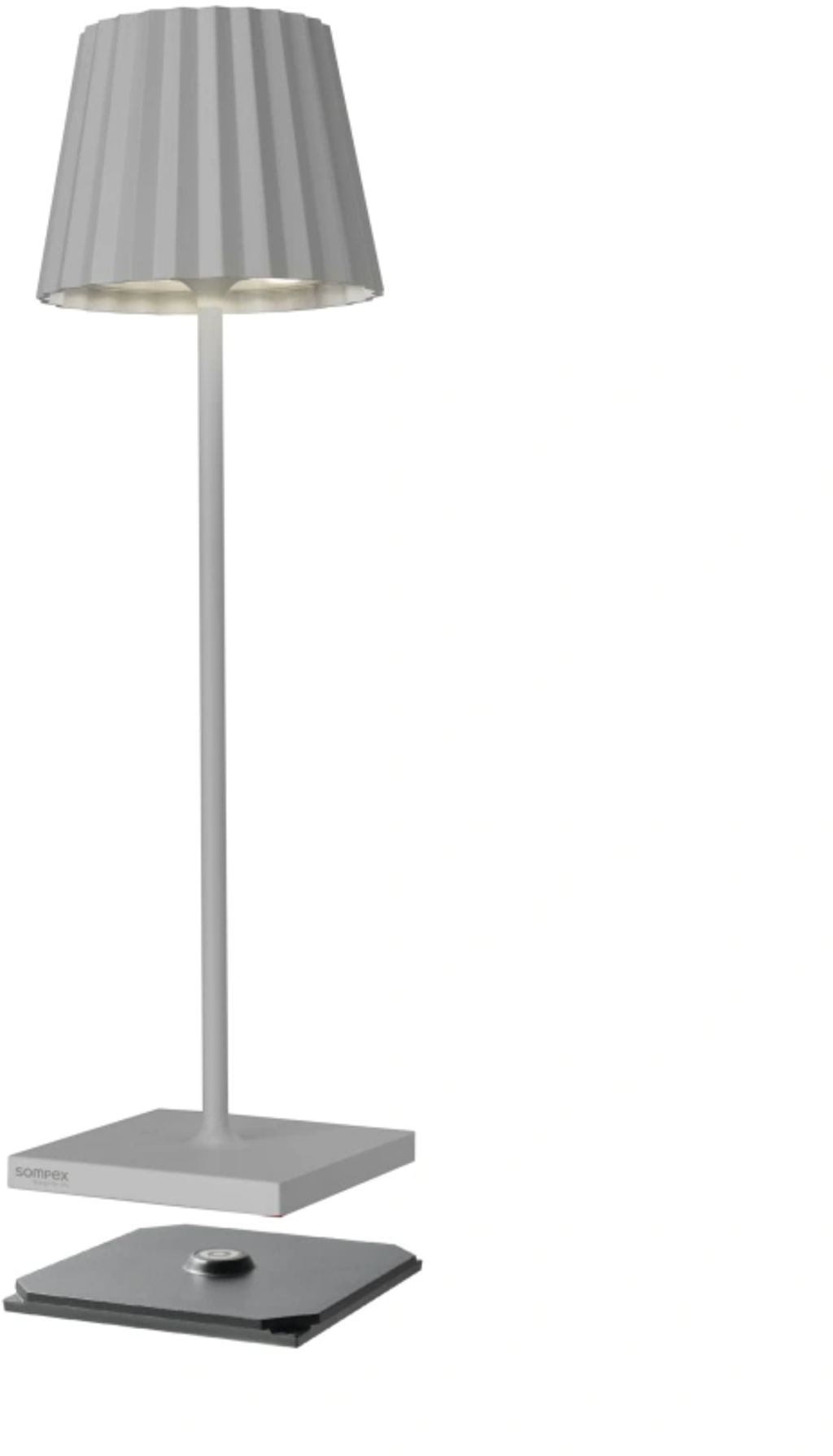 Met zijn klassieke ontwerp, dat doet denken aan de onmiskenbare plissékap, is hij een prachtig accessoire voor woonkamers, patio's en balkons en kan hij na gebruik op elk moment worden opgeladen in het oplaadstation.