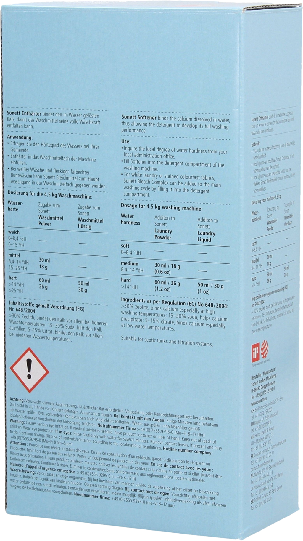 Het hoofdbestanddeel van de ontharder is zeoliet. Dit silicaat vangt de calcium- en magnesiumionen die waterhardheid veroorzaken, waardoor het water zacht wordt. Soda en citroenzuur binden de kalk zodat het wasmiddel zijn volle waskracht kan ontwikkelen en je was in een mum van tijd weer sprankelend schoon is!