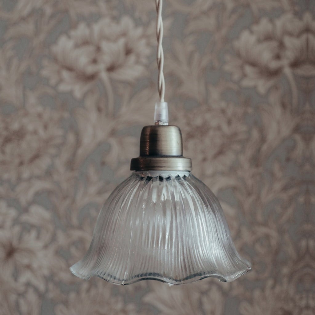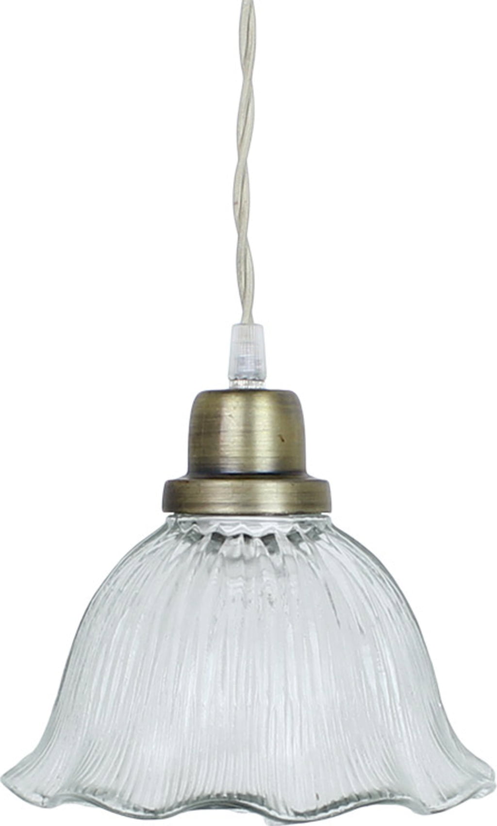 Je kunt gewoon geen genoeg krijgen van deze elegante hanglamp! De glazen lampenkap met patroon heeft een prachtig golfpatroon. De antiek koperen voet is de ideale aanvulling op de antieke look. Het 150 cm lange snoer is bekleed met beige stof.