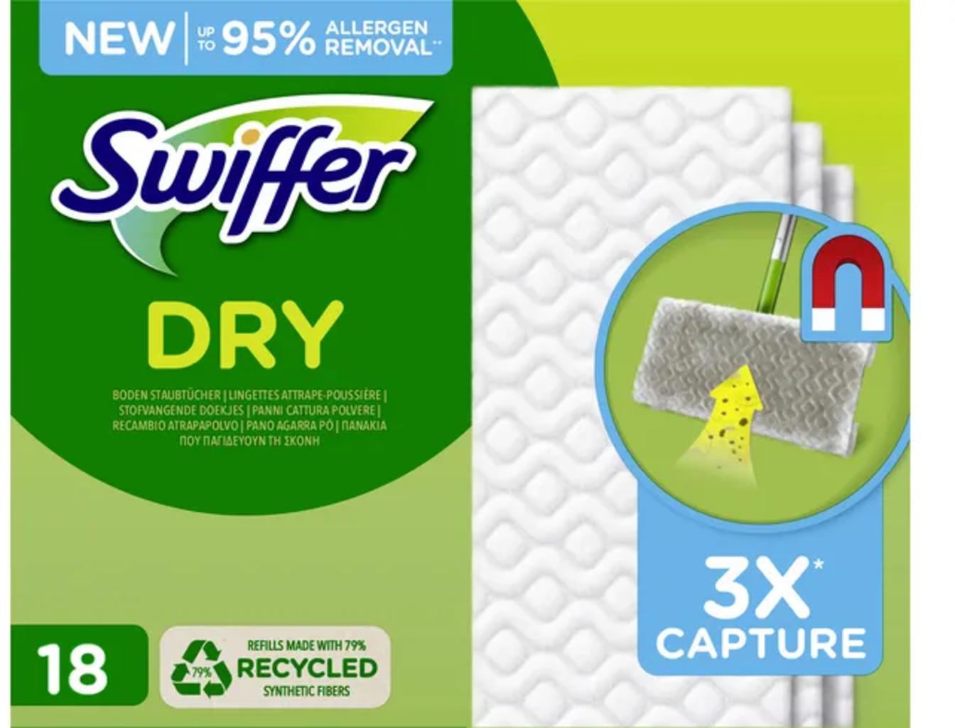 De vloer snel reinigen en stof, (dieren)haren en vuil verwijderen zonder resten achter te laten? Dit kan heel eenvoudig met de droge vloerdoekjes van Swiffer. De vloerdoekjes worden op de Swiffer vloerreiniger bevestigd en je bent klaar om te beginnen. De vezels met een unieke 3D-structuur absorberen tot 3 keer meer vuil, stof en haren en houden het verzamelde vuil vast dankzij een magnetische werking. Ideaal voor het dweilen van alle vloeroppervlakken.