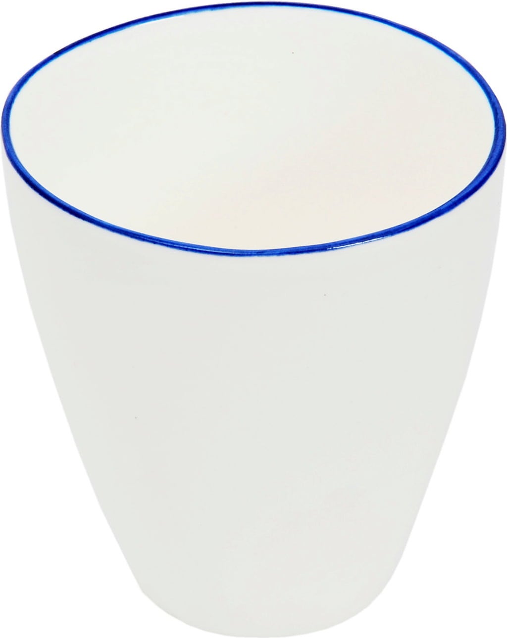De klassieke, eenvoudige en tijdloos mooie bekeris geschikt voor zowel warme als koude dranken. Het porselein is robuust en wordt gekenmerkt door de onregelmatige vorm. Dankzij de blauwe rand is de beker een echte blikvanger en een all-time favourite.