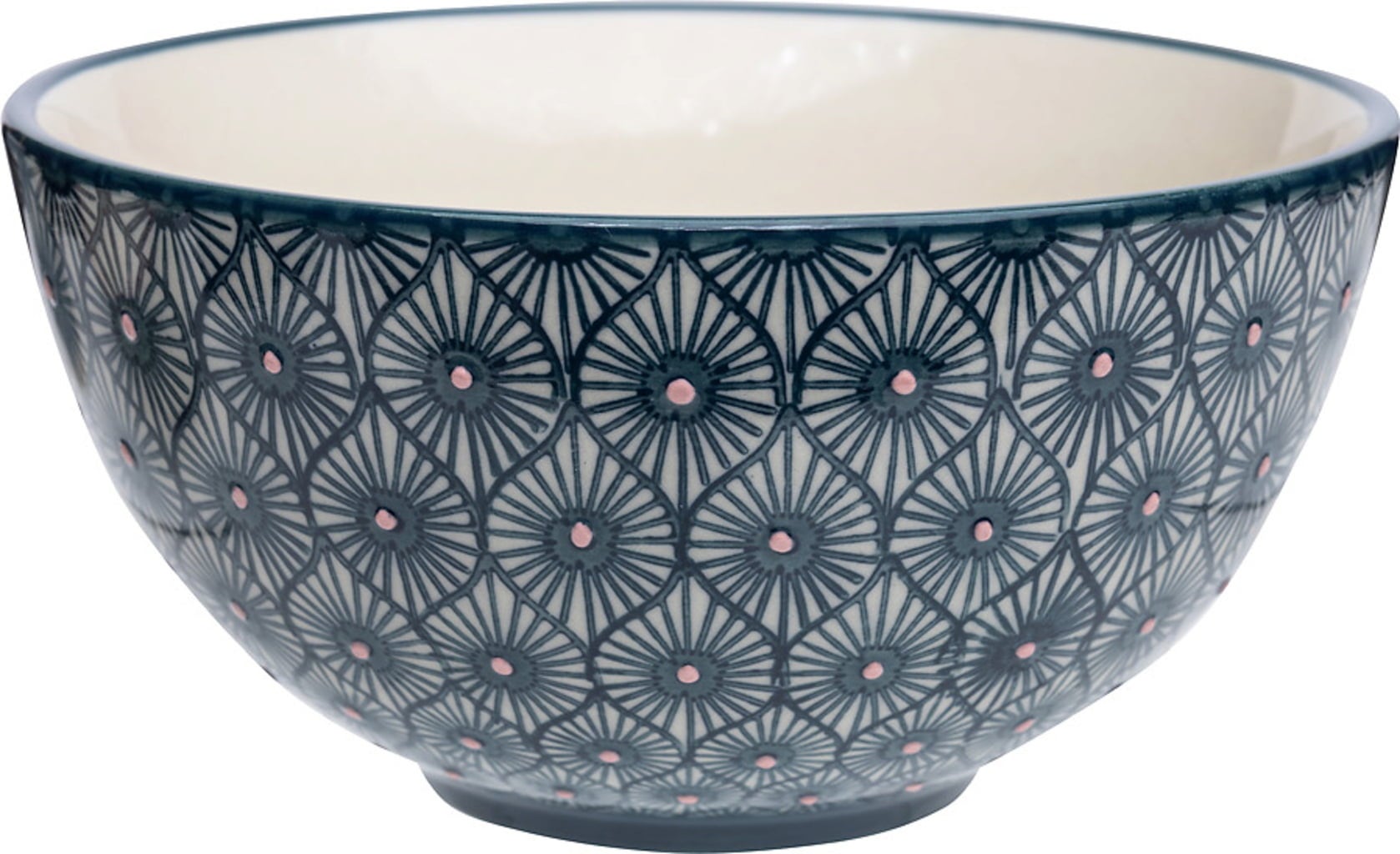 Deze handgestempelde kom maakt je servies uit het Mix'n'Match-assortiment compleet. Met zijn elegante en filigraanprint is hij een kleurrijke blikvanger bij het serveren van soepen, muesli of desserts.