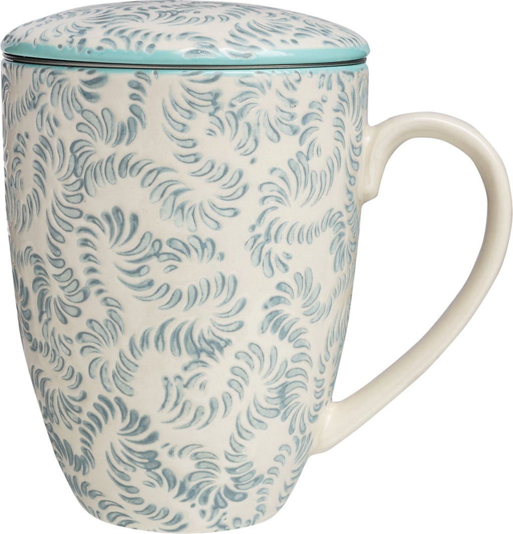 Gun jezelf een onderbreking van het dagelijkse leven met dit kopje van hoogwaardig aardewerk! Het handgestempelde patroon nodigt je tot dagdromen en het aangename gevoel zorgt voor een ontspannen theedrinkervaring. Dankzij het geïntegreerde theezeefje kun je gemakkelijk en zonder storende blaadjes van je favoriete thee genieten. Het praktische deksel houdt je drankje langer warm en kan ook worden gebruikt om het theezeefje in op te bergen als de thee klaar is met trekken. Een perfect cadeau voor jezelf of een geliefde!