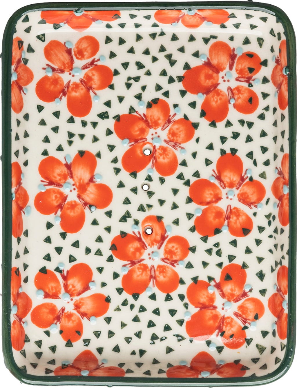 De felle kleuren en het bloemendesign, gecombineerd met geometrische details, zijn een absolute blikvanger in de badkamer! De praktische afvoergaatjes zorgen ervoor dat het water van het zeepbakje af kan lopen en de zeep goed kan drogen na gebruik.