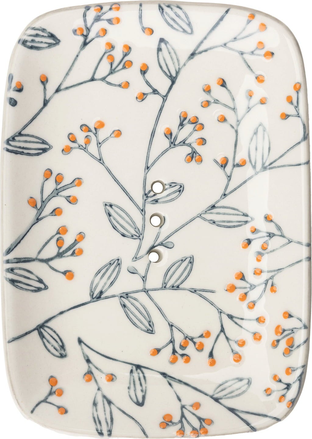 Dit zeepbakje van hoogwaardig aardewerk is met de hand gestempeld met een filigraanprint en heeft gaatjes voor de afvoer van water. Zo kan de zeep na elk gebruik goed drogen.