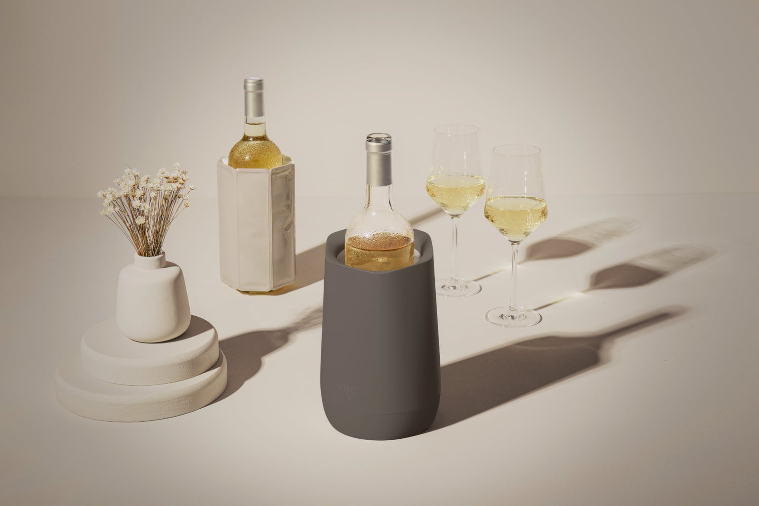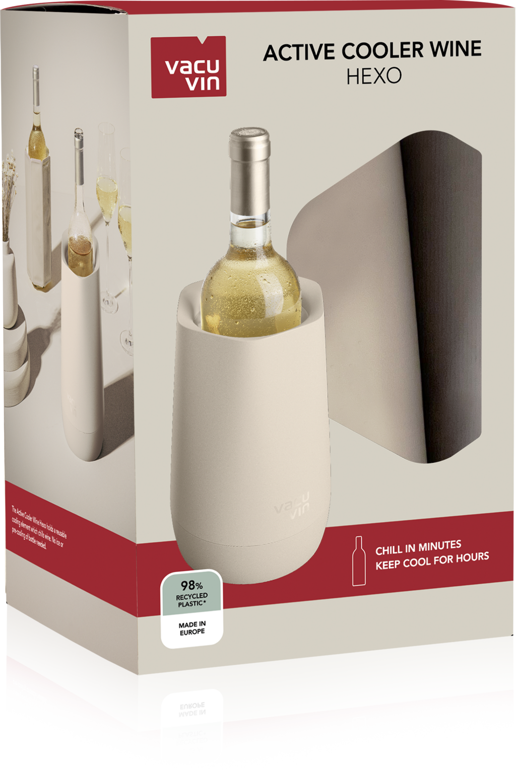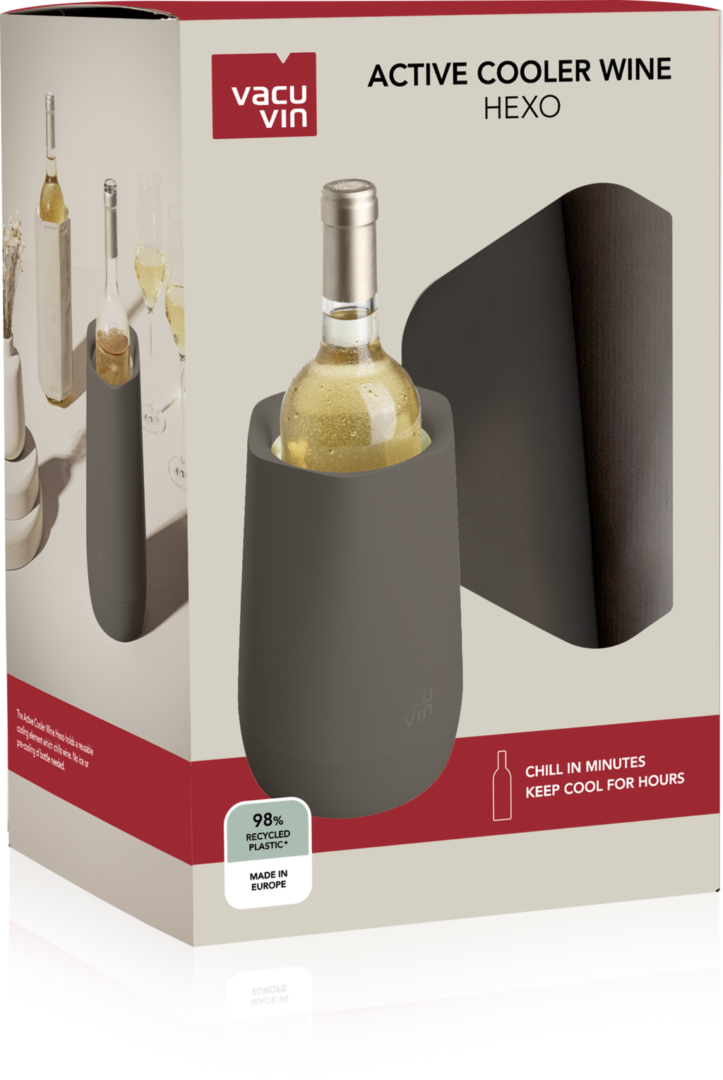 De Vacu Vin Wijnkoeler Hexo koelt je wijn in slechts 15 minuten tot de ideale temperatuur en houdt hem urenlang koel – helemaal zonder ijs. In de zeshoekige behuizing zit een uitneembare koelmanschet met innovatief koelgel, die ook apart gebruikt kan worden.