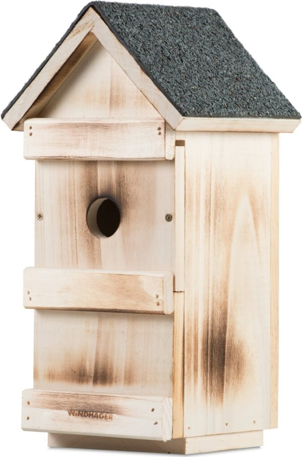 Gemaakt van geschaafd massief hout met een gevlamd oppervlak, dak bedekt met dakvilt, inclusief ophanginrichting