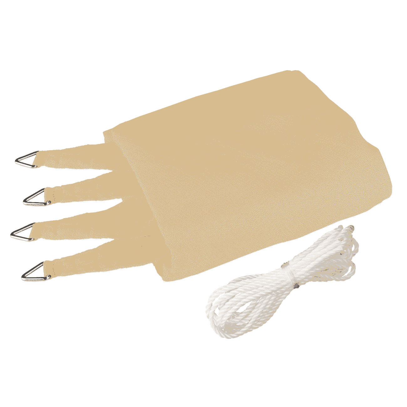 Verankering op alle hoeken. Hiervoor wordt gebruik gemaakt van verankeringselementen zoals zonnezeilmast, bevestigingsoog aan de muur, oogbout voor palen etc. Met behulp van verbindingselementen (touw, D-sluiting, karabijnhaak, spananker, expandertouw, trekveer ), wordt het zonnezeil in het verankeringselement gehaakt.