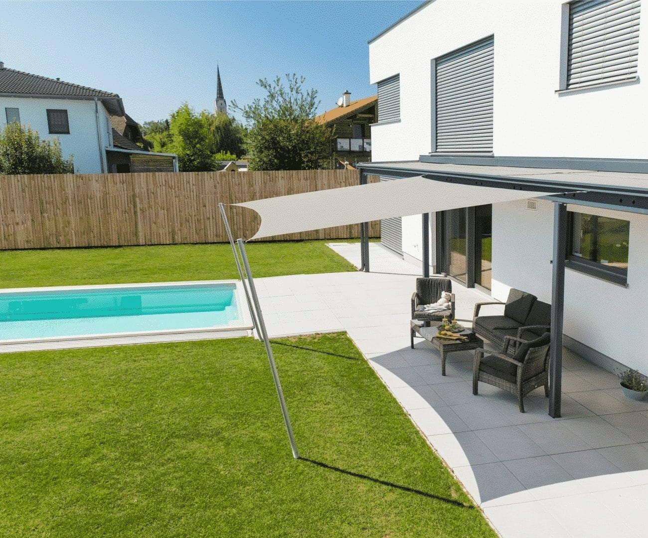 • Niet alleen een heerlijke schaduw op het terras, maar ook op het gras, boven het zwembad of in de zandbak.