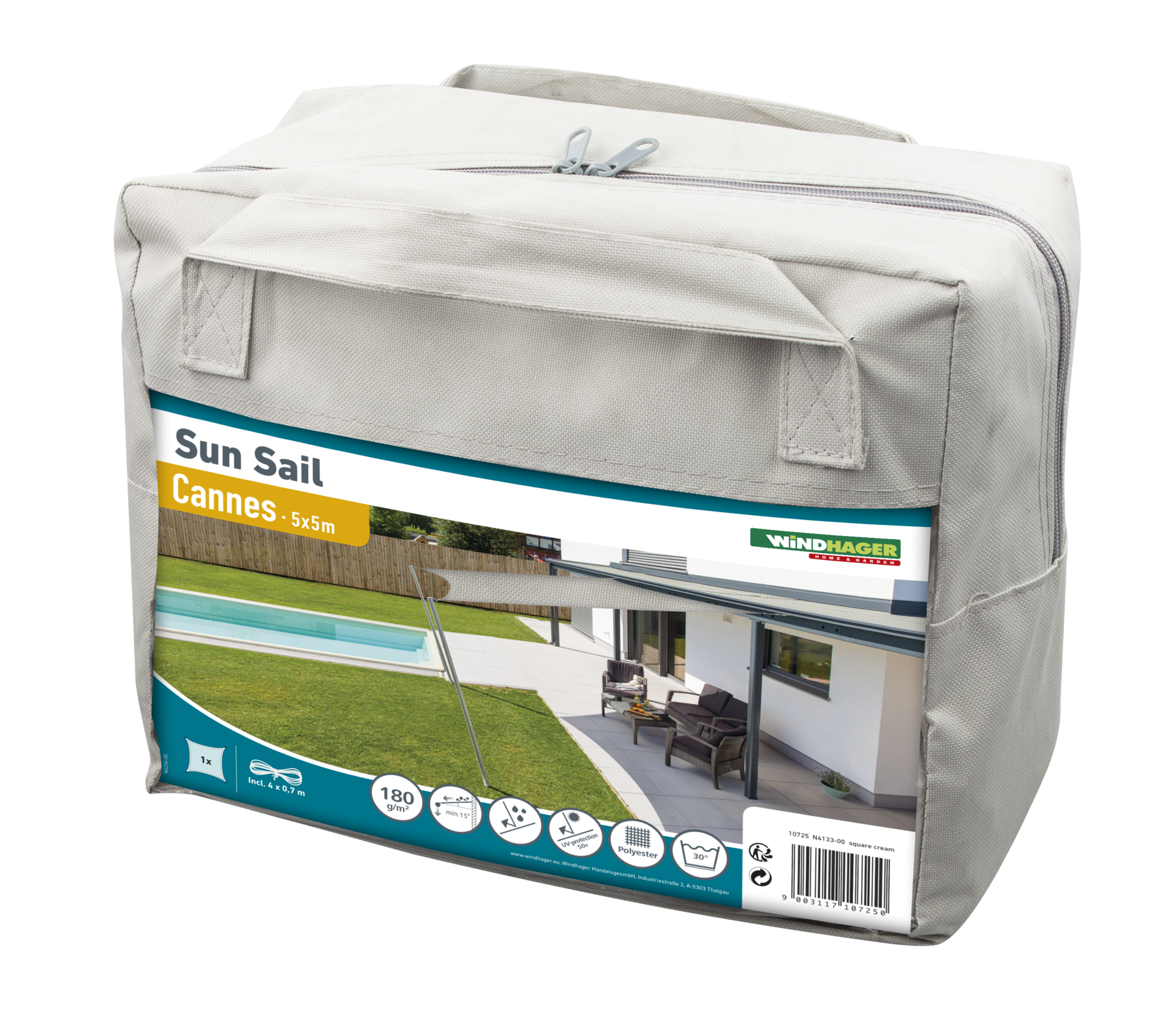 Windhager SunSail CANNES Schaduwdoek, Vierkant 5 x 5 x 5 m, Crème grijs