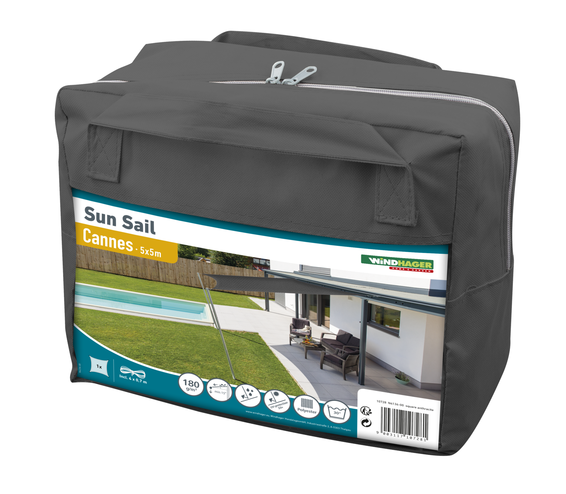 Windhager SunSail CANNES Schaduwdoek, Vierkant 5 x 5 x 5 m, Antraciet