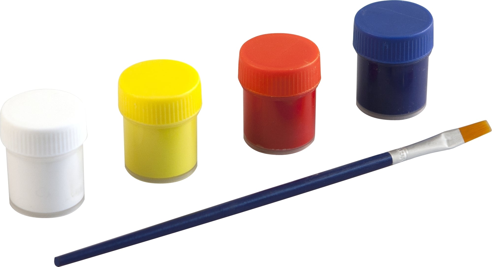 De set bevat een nestkastje, vier kleuren, een penseel en snijsjablonen.