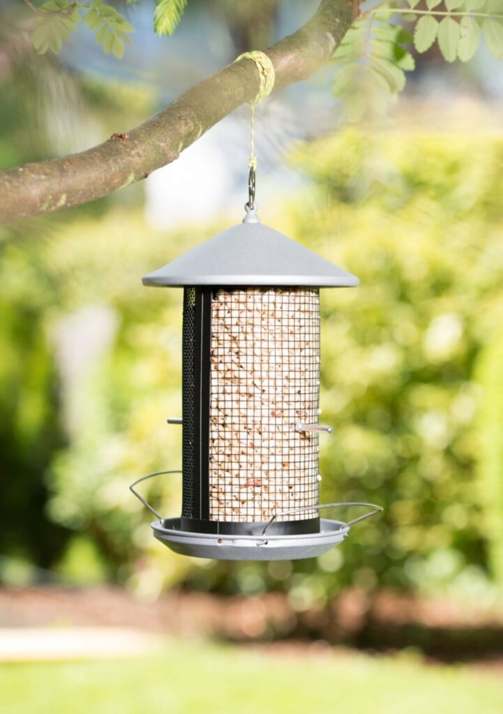 De bijzonder weerbestendige voersilo doet vele winters zijn werk. Hij is verdeeld in twee aparte voerkamers en is daardoor geschikt voor groter (bijvoorbeeld gebroken noten, zonnebloempitten) en kleiner voer. Afvoeropeningen in de voerplaat laten het water weglopen en houden het voer droog. Modern gelakt - in zwart en zilver.