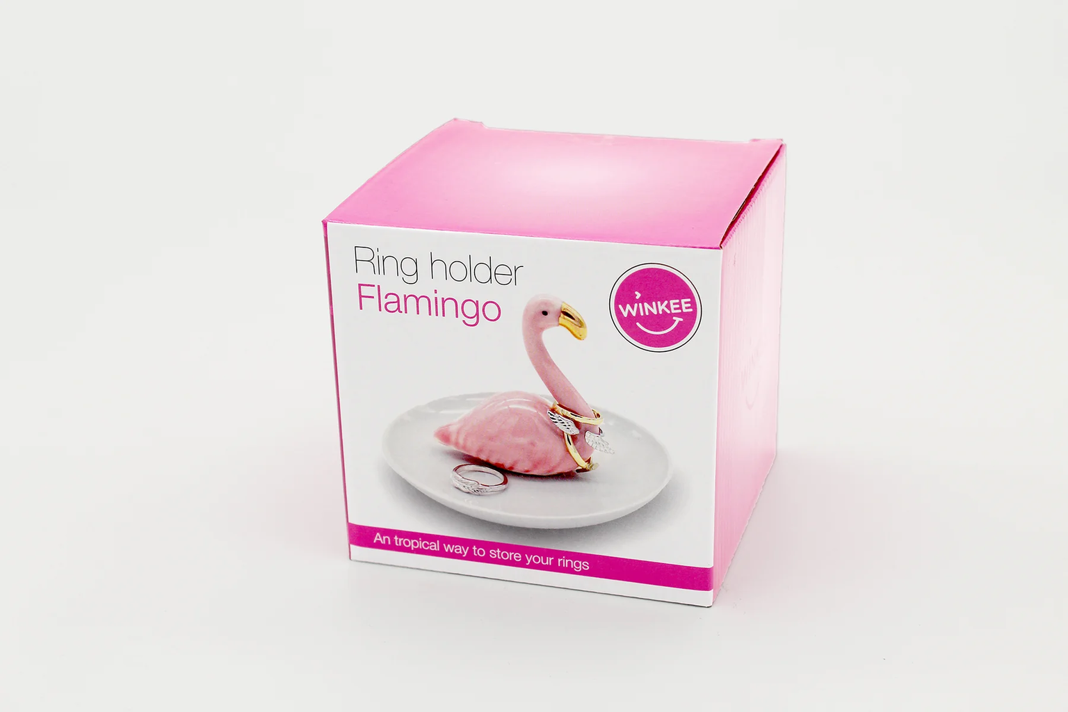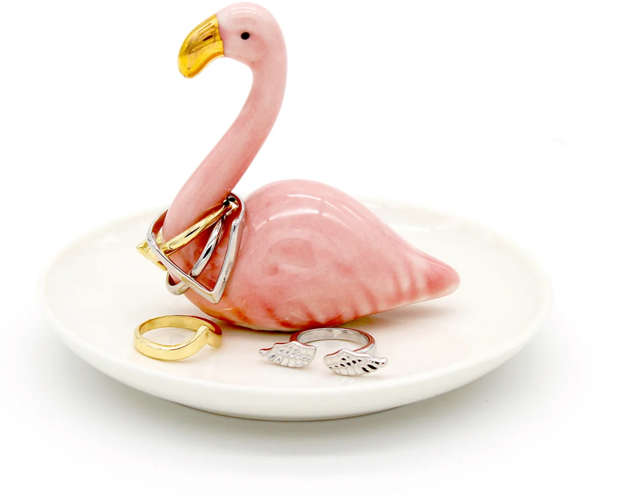 De vriendelijke flamingo heeft niet alleen ruimte voor je favoriete ringen aan zijn lange nek, maar de ronde schaal biedt ook ruimte voor oorbellen en dergelijke.
