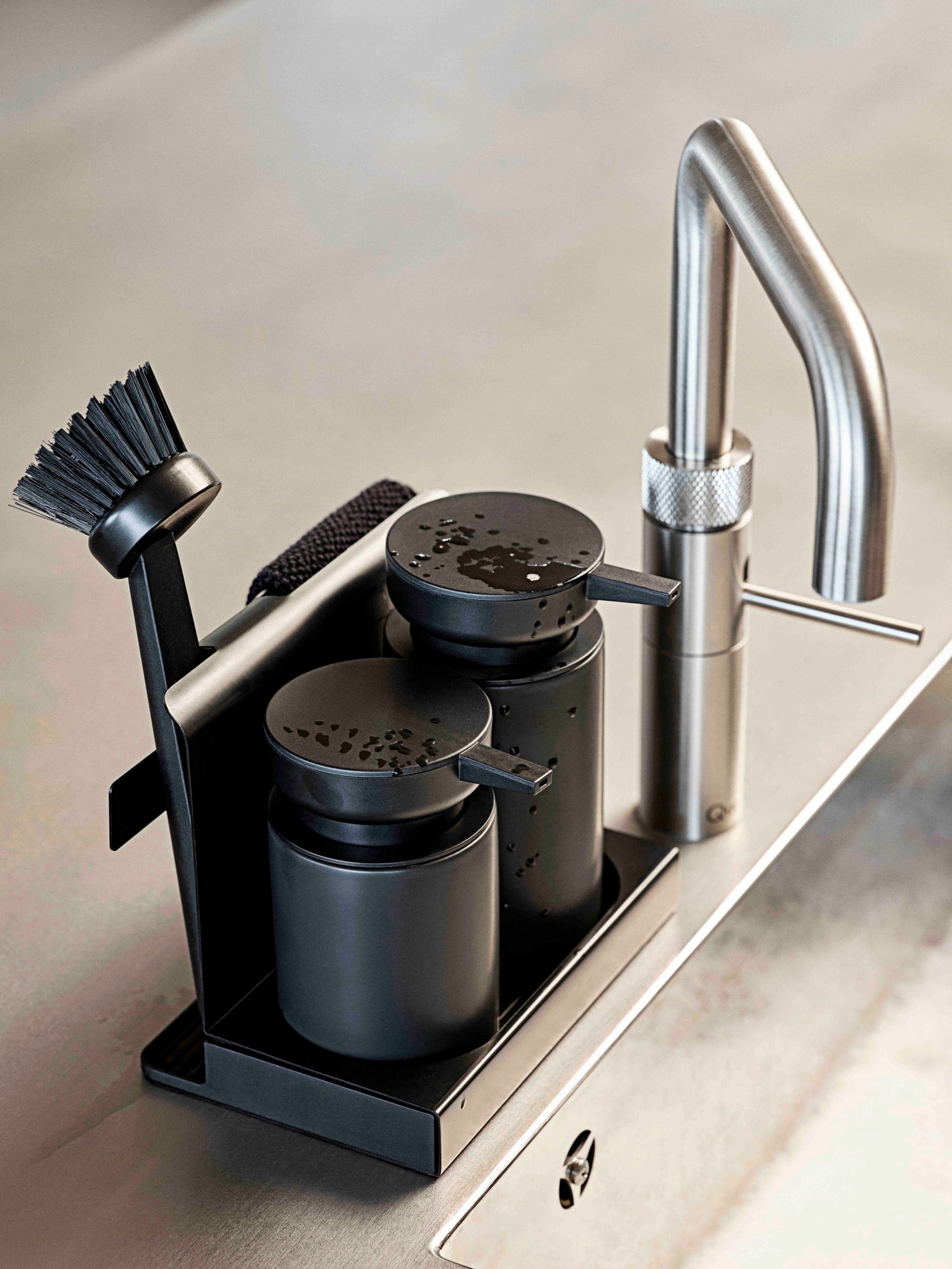 Opgeborgen in een praktische houder met een geïntegreerde lekbak, die je werkblad beschermt tegen overtollig water, vind je slimme accessoires voor de afwas.